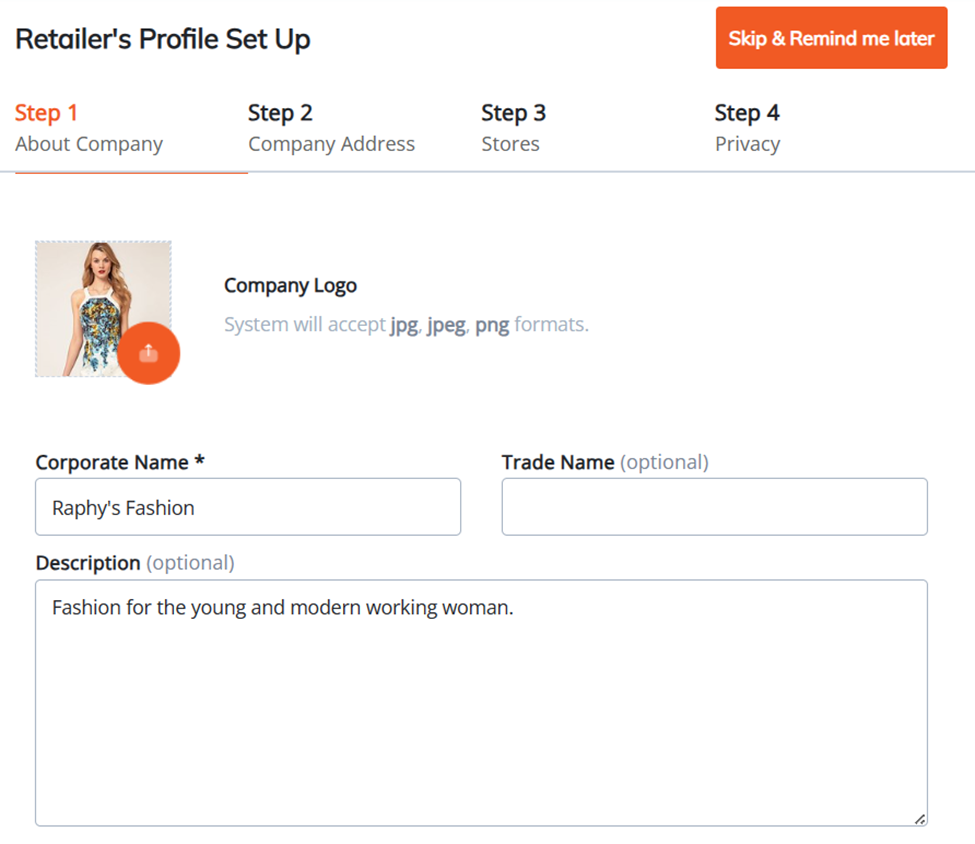 4. You will be guided to the page where you can create your Retailer's profile, comprising four distinct steps.