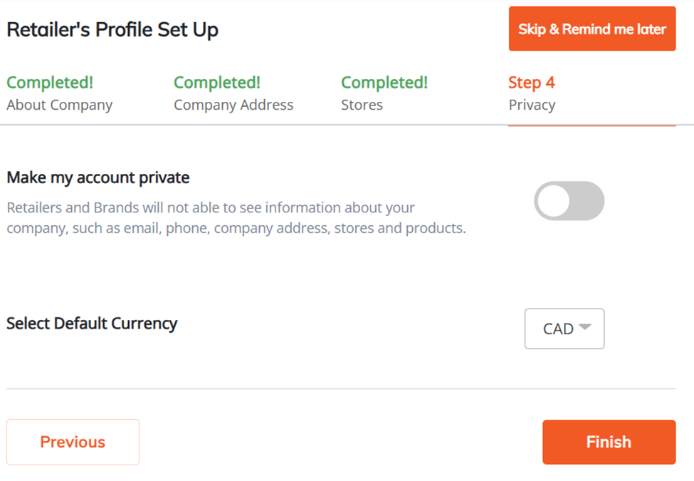 Step 4- configure your retailer's privacy settings and choose the currency in which you prefer to conduct business when placing orders.