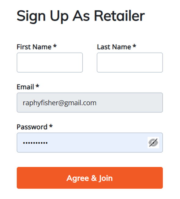 3. Subsequently, you will be directed to a "Sign Up As Retailer" screen, where you'll input the required information. Once completed, click on "Agree & Join":